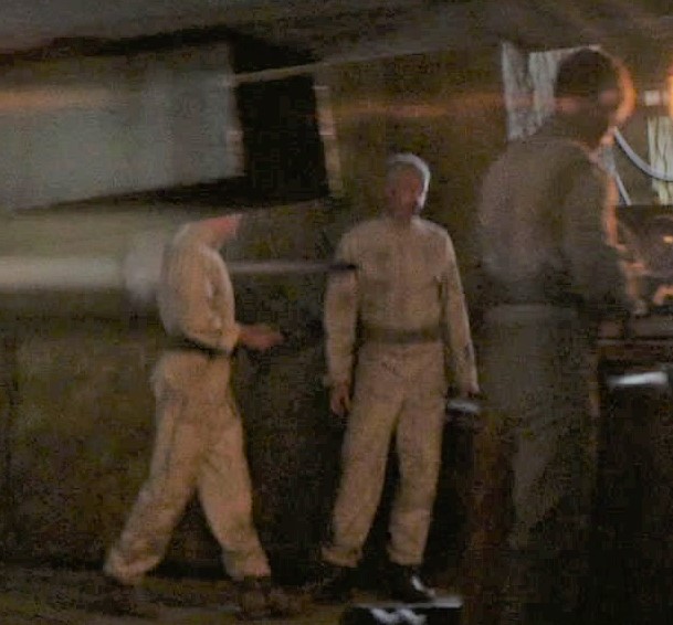 – Code cylinder pocket on outside of the wearer’s upper middle left arm, centered to the shoulder seam, divided into 5 pen sleeves. Pocket is rectangular, width is a approximately 5 inches (12.5 cm) with seams between code cylinders 1 inch (2.5 cm) apart, height is slightly taller than the width by approximately 1 inch (2.5 cm).